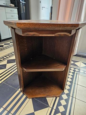 Compact bruin hoekkastje, ideaal voor kleine ruimtes. Afmetingen: 70 cm hoog, 40 cm breed en 40 cm diep. Perfect voor het opbergen van spullen of als decoratief element in de hoek van de kamer.