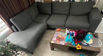 Comfortabele grijze hoekbank voor vier personen of meer. De bank is in gebruikte staat en gemaakt van stof. De breedte is 250 tot 300 cm en de diepte is 75 tot 100 cm. Ideaal voor een gezellige zithoe