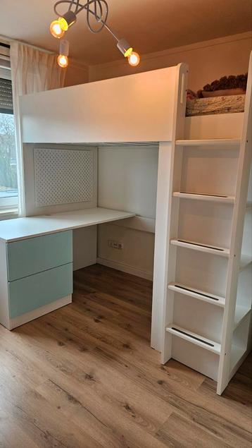 Praktische hoogslaper ikea smastad 2 jaar oud met ingebouwd bureau en kastruimte. Ideaal voor kleine kamers om ruimte te besparen. De ladder maakt het makkelijk om in bed te komen. Onder het bed is er