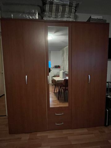 Houten kledingkast met spiegel. Links en rechts veel ruimte om kleding op te hangen. In het midden en boven legplanken. Onderin twee lades. Het is een mooie stevige kast.
