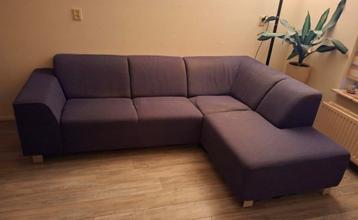 Comfortabele hoekbank met chaise longue in een antraciet/blauwe kleur. De bank is ongeveer 230 cm breed en de chaise longue is ongeveer 170 cm diep. De bank heeft gebruikerssporen en vlekken. Gratis a