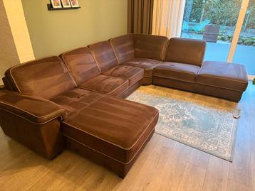 Ruime u bank met comfortabele zitplaatsen. De bank is in gebruikte staat en vertoont duidelijke gebruikssporen(zie foto). Het materiaal is stof. Voor de maten zie de foto’s