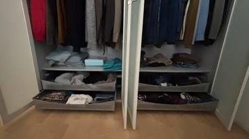 Dubbele lichtgrijze kledingkast, bestaande uit twee delen van elk 1 meter breed. De deuren zijn uitgevoerd in melkglas. De kast beschikt over twee lades per deel, dus in totaal vier lades. De kast is