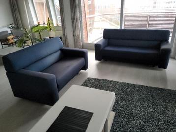 Bankstel bestaande uit 2 gelderland banken van de bekende ontwerper jan des bouvrie. Blauwe ploegstof bekleding. Bank 1: zitvlak 150 cm + 2 leuningen van 20 cm. Totaal 190 cm breed bank 2: zitvlak 120