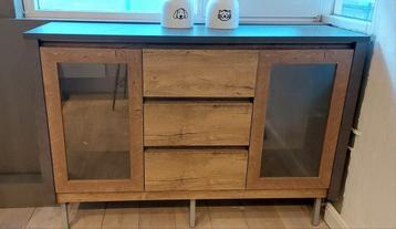 Mooie servieskast met 3 lades en 2 deuren. De kast is 140 cm breed, 100 cm hoog en 43 cm diep. Ideaal voor het opbergen van servies, boeken of andere spullen. De kast is in goede staat.