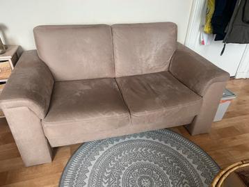 Beige tweezitsbank. Ideaal voor een kleine woonkamer of studentenkamer. Afmetingen zijn 160 cm breed en 90 cm diep. In het midden wat doorgezakt.