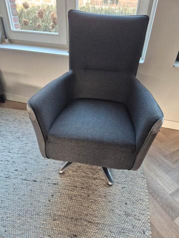 Comfortabele draaifauteuil met stof aan de binnenkant en kunstleer aan de buitenkant. De stoel zelf zit nog prima, maar het kunstleer aan de zijkanten is afgebladderd. Als de stoel aan de zijkant opni