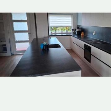 Gebruikt hpl aanrechtblad met een wasbak (30x40cm), zonder kraan. Het blad is 343,8cm lang, 100cm breed en 32mm dik. Er is gebruikersschade aanwezig. Het blad is vervangen vanwege een slechte verlijmi