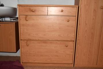 Schoenenkast met 2 laadjes en 2 kleppen voor schoenen. Goede conditie. Beukenfineer. Afmetingen : lxbxh : 87x35x97 cm de kast kan gratis afgehaald worden, maar alleen a.s. Zaterdag 21 februari in uitg