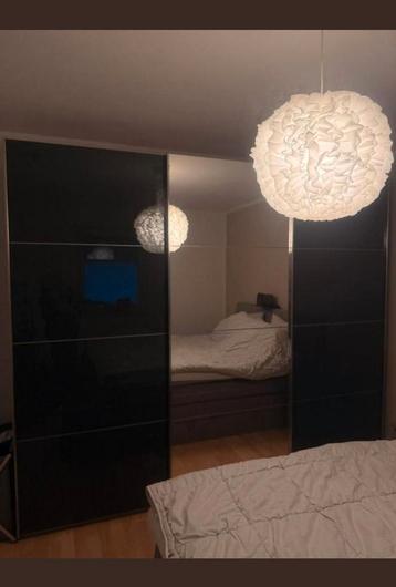 Grote schuifdeurkast met spiegeldeuren. De kast is gebruikt, maar in goede staat en biedt veel opbergruimte. De kast is voorzien van lades, deuren, planken en hangruimte. Afmetingen: 271 cm breed, 59