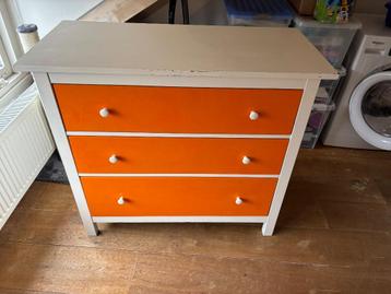 Ladenkast te geef. 3 Lades. 110,2Cm breed, 51,3cm diep en 96,5cm hoog. Was zwart, zelf wit en oranje geverfd. Plaat van de bovenste plank is verbogen door het gewicht en moet vervangen worden of opnie