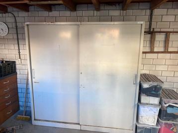 (gratis, zelf ophalen/ versjouwen, alleen in de weekenden) een gebruikte stalen kast met schuifdeuren. De kast heeft enkele gebruikssporen en roestplekken, maar is verder in goede staat. Ideaal voor o