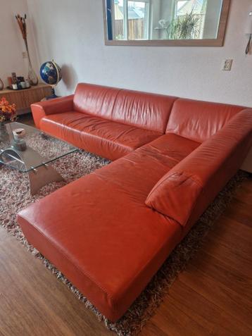 Kan nog prima een ronde mee, mooie oranje hoekbank leer, met kleine beschadiging op het zitvlak gedeelte. Afmetingen breedte 285 diepte 210 hoogte 70 zithoogte 40 cm. Gratis af te halen in uden voor 2