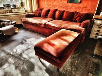 4 zits bank met hokker. De bank zit en ligt heerlijk vanwege de pocketvering in de zitkussens. Hij heeft gebruikerssporen en er zitten een paar kleine gaatjes in. Wel is de bekleding vorig jaar nog ma