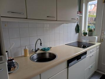 Voor een 2e kans: aanrechtblad 220 cm. X 60 cm. Met gootsteen en een zelfde maar smaller werkblad 216 cm x 37 cm. Licht houtkleurig gelamineerd.