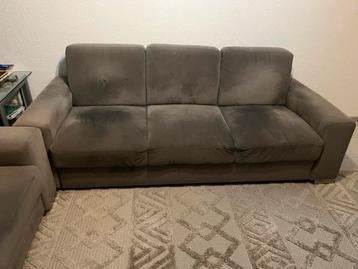 Mooie grijze zitbank. De bank is comfortabel en biedt plaats aan meerdere personen. Bestaande uit een 3-zitsbank en twee 1-zits fauteuils. De bank heeft metalen poten. Zitbank: stof bekleed op metalen