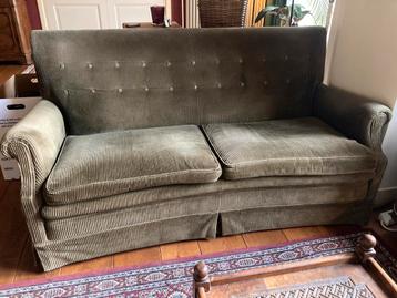 Comfortabele tweezits bank bekleed met ribfluweel. De bank is 160 cm breed, 85 cm hoog en 85 cm diep. Er is lichte slijtage aanwezig en er mist een knoopje. Verder in goede staat.