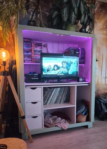 Computer/tv kast, met uitschuifbaar bureautje. Afmetingen 120cm bij 61cm bij 160cm. In kleuren lichtgroen en licht roze. Evt incl led verlichting. Het is een diepe, zware kast, maar hij staat niet wat