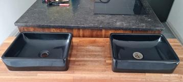 Twee zwarte waskommen. Afmetingen 40 x 30 cm en 12 cm hoog. De conditie is goed. Exclusief kraan en afvoer.
