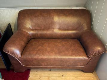 Comfortabele bruine leren 2-zitsbank. +~ 140 Cm. De bank is in zeer goede staat, geen beschadigingen. Mag weg wegens overbodig, staat in de weg.