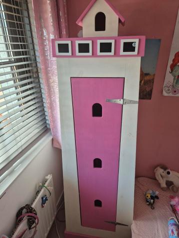Leuke en unieke vuurtorenkast in roze en wit gestreept design. De kast is 192 cm hoog (tot het puntje), 48 cm breed en diep aan de bovenkant, en 63 cm breed en diep aan de onderkant. Let op: de kast k