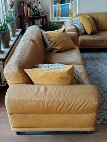 Bankstel, okergeel, 3, 2.5 Zit leder. 3 Zit (2.36*0.86) 2.5 Zit (2.16*0.86) Inclusief nieuw onderhouds middel. Per direct beschikbaar.