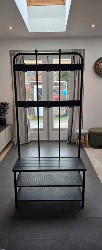 Mooie en praktische kapstok met een schoenenrek. Ideaal voor de hal of entree. Gemaakt van metaal. Biedt ruimte voor jassen, tassen en schoenen.