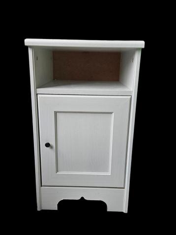 Set van twee witte nachtkastjes. Gemaakt van hout, met een deur en open vak. Ideaal voor naast het bed. In goede staat.