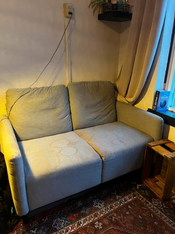 Veelgebruikt tweezitsbankje, zitten vlekken in maar met een leuk kleedje (zie foto 2) nog prima bruikbaar. Op te halen in groningen. 135X 80cm