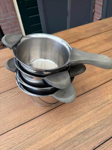 Complete bk q-linair pannenset, bestaande uit 4 pannen. De pannen zijn stapelbaar en voorzien van een afgietsysteem. Altijd gebruikt op gas, waarschijnlijk niet geschikt voor inductie gezien de leefti