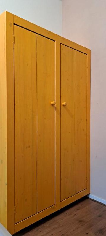 Grenen massieven kast. Ongeveer 180 cm hoog, 112 cm breed links is hanggedeelte, rechts planken. Binnenkant is ongeverfd. Buitenkant kan een lik verf gebruiken. Gratis af te halen. We demonteren de ka