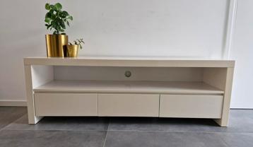 Modern tv meubel met 3 lades in glanzend gebroken wit. Ideaal voor het opbergen van media-apparatuur en accessoires. Bovenop (zie foto) enige verkleuring. Verder prima. Lengte 150 cm breedte bijna 40