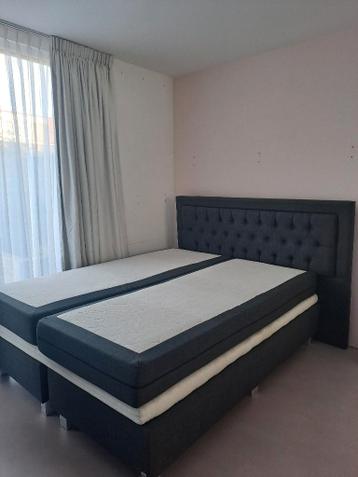 ​kleur: antraciet topper niet inbegrepen (zit nu onder het matras in de foto's) matras wel inbegrepen (2 helften) door verhuizing is de bekleding van het hoofdbord in beide hoeken beschadigd. Voor