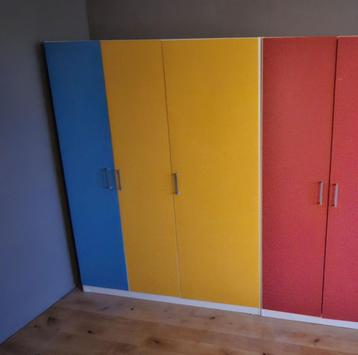 Ikea kledingkast, met 3 deuren. Breedte 140cm hoogte 180cm diepte 50cm witte basis, met 2 gele deuren en 1 blauwe deur (de kast rechts met de roze deuren is niet te koop, die hou ik zelf). Op de foto