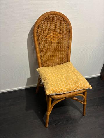 Gratis rieten stoel met een gele kussen. De stoel is in goede staat en kan direct worden opgehaald.