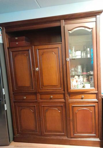 Een houten servieskast met veel opbergruimte. Kan nog een ronde mee. De kast is voorzien van deuren en lades, ideaal voor het opbergen van servies, glaswerk en andere spullen. De kast bestaat uit 3 de