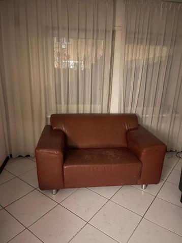 Roodbruine 2 zitsbank, leer. B150, h80, zithoogte 40cm.