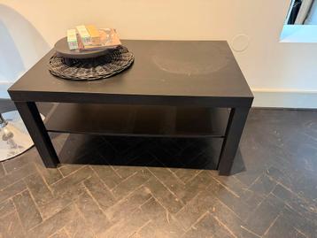 Een nette, zwarte salontafel met een handig onderblad voor extra opbergruimte. De tafel is in gebruikte staat, maar nog steeds stevig en functioneel. Ideaal voor in de woonkamer om spullen op te zette