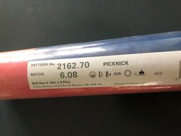 Geblokt behang, rood oranje en licht paars. Drie rollen van 10 meter bij 53 cam. Gratis af te halen