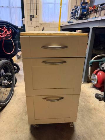 Gratis keukenkastje op wielen, ideaal voor gebruik in de garage of werkplaats. Gebruikt voor gereedschap. Bovenste lade is een beetje los en moet even vastgezet worden. Verder in prima staat.