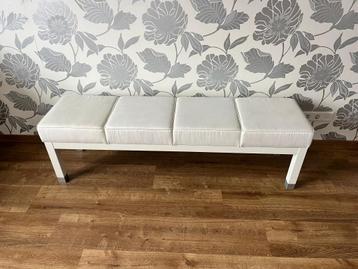 Wit bankje met kussens bovenop. Perfecte maat voor aan het voeteneinde van een bed! Gratis af te halen.