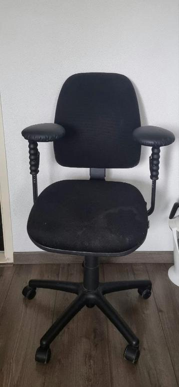 Een gebruikte zwarte bureaustoel met armleuningen. De stoel is in goede staat en comfortabel om op te zitten. Ideaal voor thuiswerken of studeren. De stoel is in hoogte verstelbaar en heeft wieltjes.