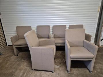 Set van 6 comfortabele eetkamerstoelen met wieltjes. De stoelen zijn bekleed met een stoffen bekleding en hebben een stevig frame. Ideaal voor een eetkamer of vergaderruimte. De wieltjes maken het gem