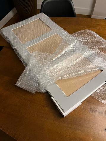 Nieuwe, ongebruikte fotolijst van 34 x 70 cm. De lijst is grijs en wordt geleverd inclusief een passepartout voor een drieluik.