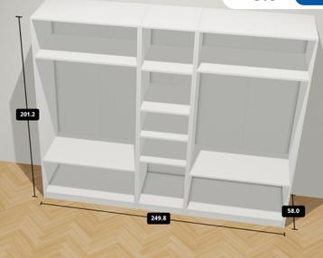 Gebruikte pax kast zonder deuren 3 delen in totaal 2,5 breedt en 2m hoog met 2 roedes en de nodige planken kast is al uit elkaar gehaald