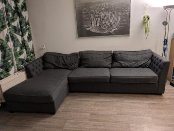 Gratis op te halen in leiden: grote, comfortabele hoekbank in donkergrijze stof (met chaise longue). Gekocht in 2018 (destijds €500–€600). Bank is ongeveer 3 meter breed. Staat: gebruikt. Id