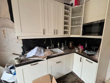 Hoekkeuken met kasten en een zwart keukenblad. Inclusief spoelbak en kraan, oven en magnetron. Zonder koelkast en vaatwasser. Uiteraard met gebruikssporen. Zelf demonteren in zeist.