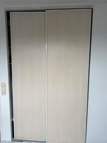 Schuifdeursysteem met rails. Deuren hangend aan rolletjes en onderaan geleiders. Deuren zijn platen met metalen frame. Boven rail zit afscherm kap bij. Maten van het systeem en dus kastgat zijn: 232.5