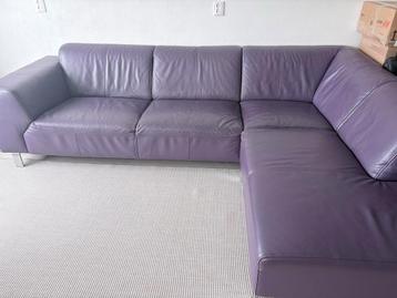 Mooie, comfortabele lila lederen hoekbank. Geschikt voor vier personen of meer. De bank is in gebruikte staat, maar nog steeds in goede conditie. De breedte is tussen de 250 en 300 cm en de diepte is