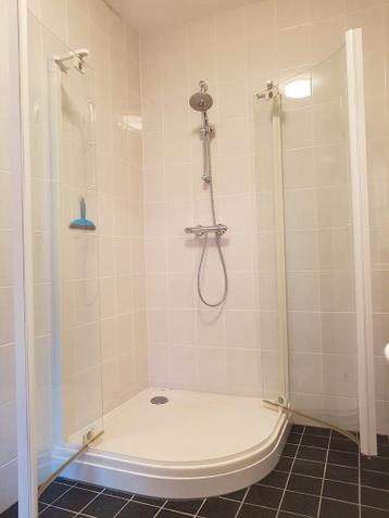 Een witte hüppe kwartronde douchecabine. De douchecabine heeft een hoekinstap en bestaat uit twee glazen draaideuren en een kunststof douchebak. In gebruikte staat. Afmetingen: - hoogte douchedeur cir